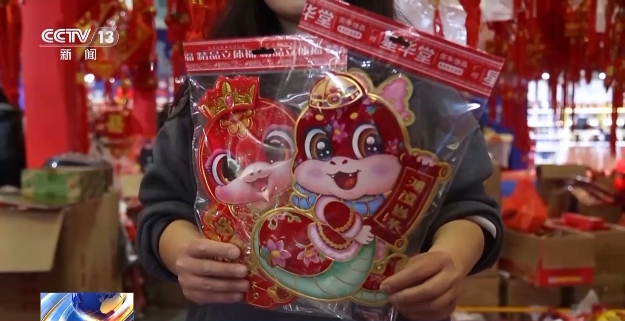 在年貨市場上,隨處可見生肖蛇年的喜慶元素。蛇年春聯也備受消費者喜愛。