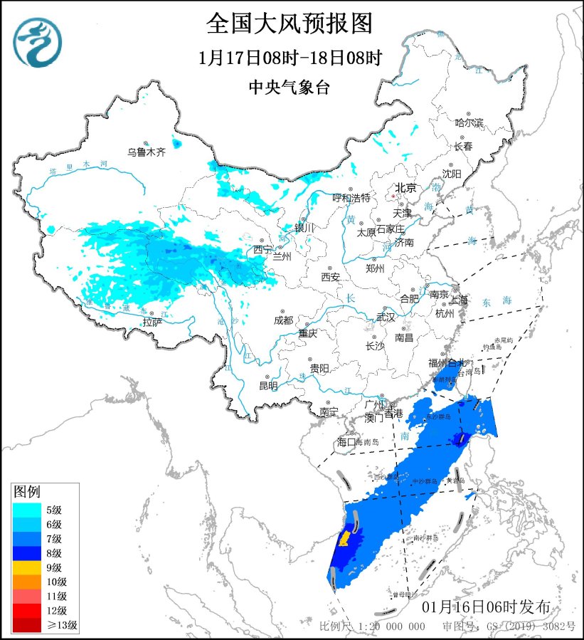 1月17日08時至18日08時,西藏中部、青海中部和南部、內蒙古西部、甘肅西北部等地將有5~6級、陣風7~8級的大風;台灣海峽、巴士海峽、南海東部和西南部海域將有7~8級、陣風9級的東北風,其中南海西南部的部分海域風力可達9級、陣風10級。