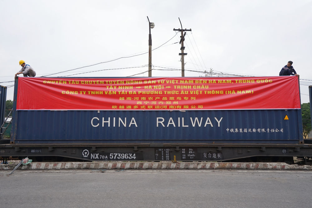 2024年1月15日,載有1000噸木薯澱粉的中越班列列車從越南河內啓程,駛向中國鄭州。新華社記者 胡佳麗 攝