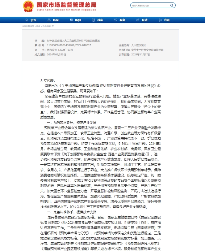 2024年3月,國家市場監管總局等聯合印發了《關於加強預製菜食品安全監管 促進產業高質量發展的通知》,專門提出對預製菜產業的食品添加問題實行嚴格的監管要求。要求預製菜生產經營企業嚴格按照法律法規和標準要求生產,切實保障預製菜產品食品安全。