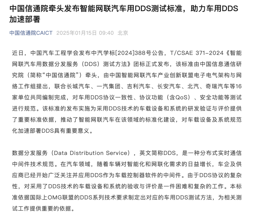 【環球網智駕綜合報道】1月16日消息,中國汽車工程學會發布中汽學標[2024]388號公告,T/CSAE 371-2024《智能網聯汽車用數據分發服務(DDS)測試方法》團標正式發佈,該標準由中國信息通信研究院(簡稱“中國信通院”)牽頭,由中國智能網聯汽車產業創新聯盟電子電氣架構與網絡工作組提出,聯合長城汽車、一汽集團、吉利汽車、長安汽車、北汽、奇瑞汽車等16家單位共同編制完成,對車用DDS協議一致性、協議功能(含QoS)、安全功能等測試進行規範。