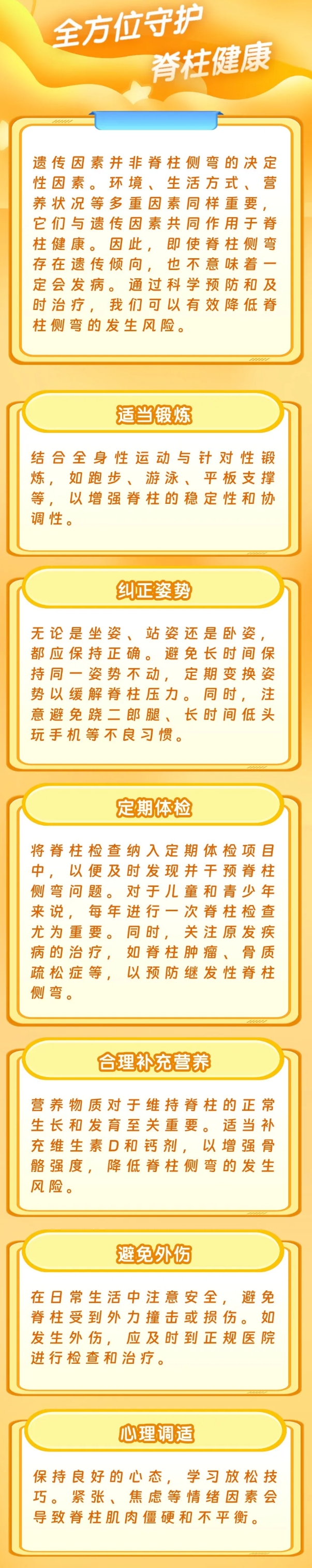 對於神經纖維瘤病患者而言,脊柱側彎的合併發生是雪上加霜,使得治療難度和複雜性顯著增加。由於神經纖維瘤病可能持續發展,且脊柱側彎的矯正和康復需要長時間的努力,因此,患者需要長期隨訪和康復。醫生要定期評估患者的病情變化和治療效果,及時調整治療方案和康復計劃。患者也要積極配合醫生的治療和康復建議,堅持鍛鍊和康復訓練,以提高生活質量和預後效果。