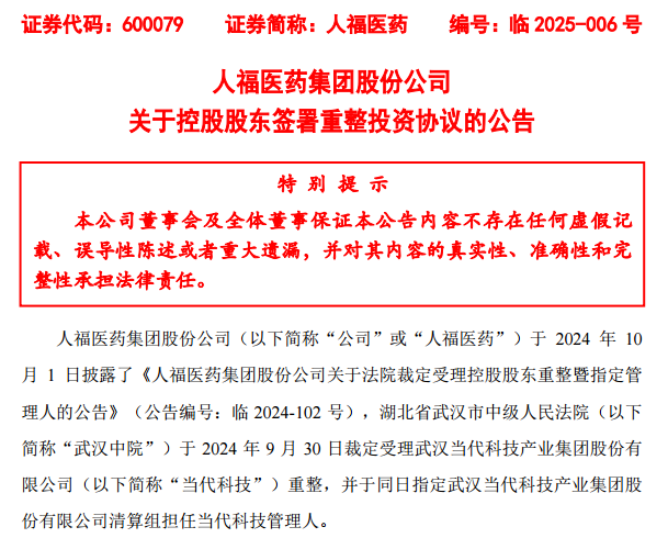 根據公告,當代集團目前仍持有人福醫藥23.70%的股份,但股權已全部被司法標記及輪候凍結。一旦當代集團的重整計劃獲得法院批准並執行,這部分股權及對應表決權將全部轉移至招商創科手中。