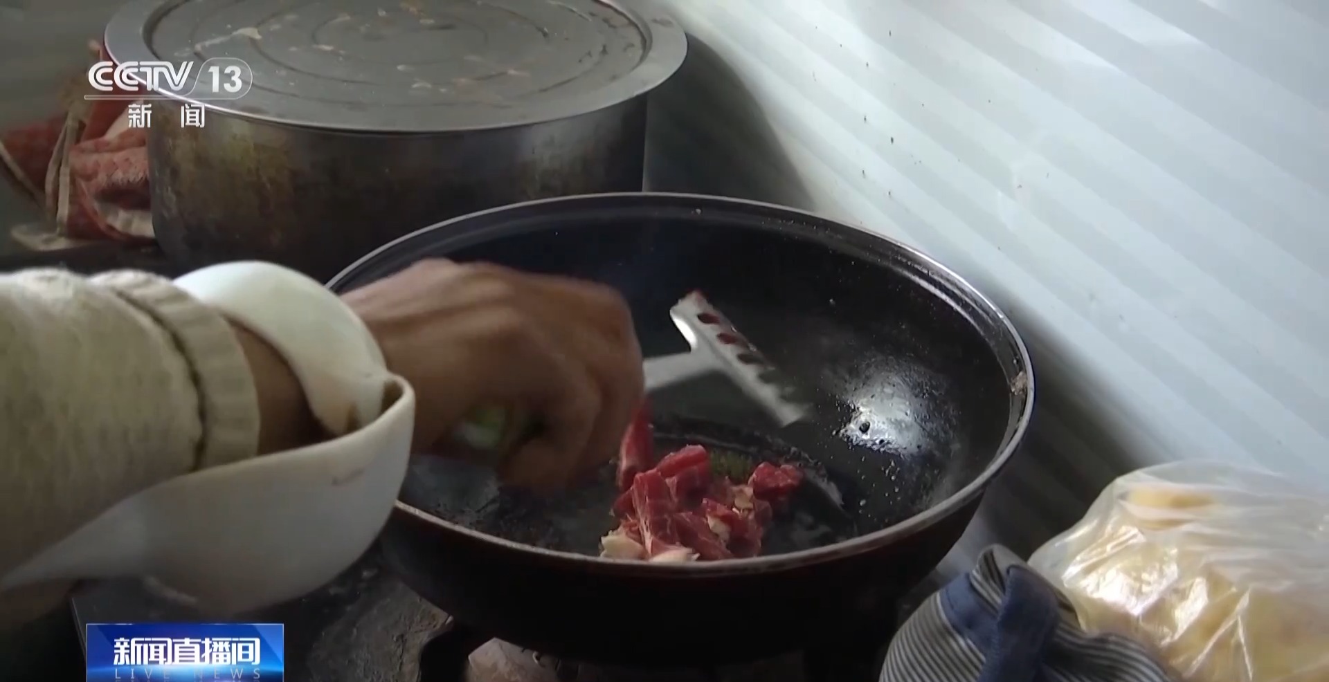 晌午時分,走進村民桑傑多吉家的板房,煤氣灶、爐子等各類物資一應俱全,他的妻子德吉卓嘎正在給一家人準備午飯。