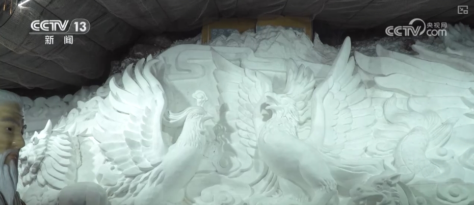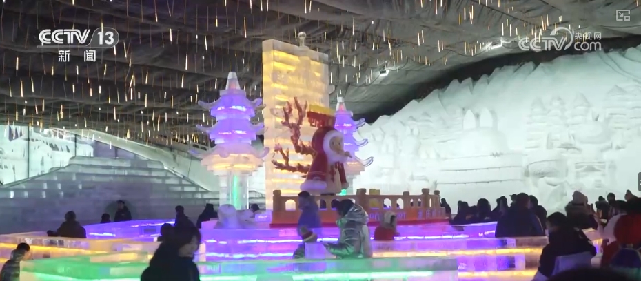 這些作品在傳統冰燈藝術的基礎上,巧妙融合了西遊、仙俠等熱門IP元素。作為每年保留項目的冰川飛瀑,2025年也新增了氣膜燈和精品雪雕作品,吸引大量遊客駐足拍照。