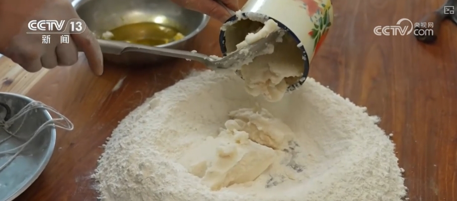 按比例調配白麪與豬油,充分攪拌均勻後揉團。酥油切成大小一致的小塊,包在揉好的麪糰中,然後就要把包了酥油的麪糰擀製成這樣的月牙形。