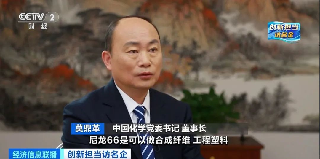 *中國化學黨委書記 董事長 莫鼎革:*尼龍66可以做合成纖維、工程塑料,它的主要特點是高強度、耐高温,甚至可以代替金屬,比如做發動機的機殼,可以實現汽車、飛機、無人機的輕量化,也可以做成服裝。