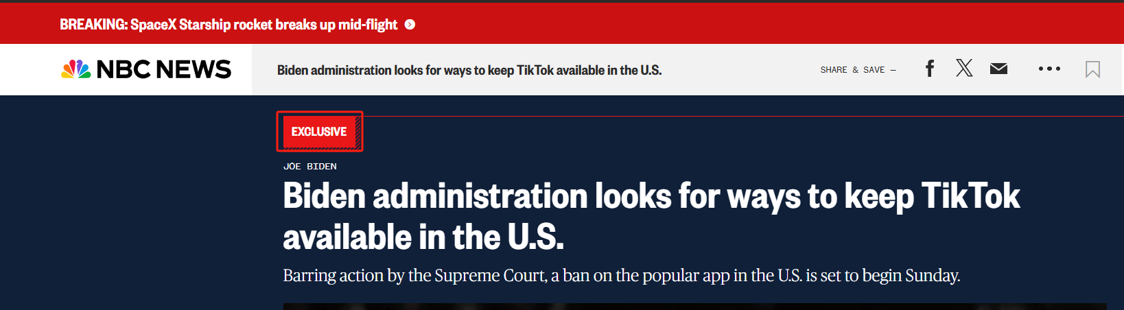 2024年4月,美國總統拜登打着所謂“保護國家安全”的旗號,簽署一項國會通過的*“不賣就禁”法案*,要求TikTok母公司字節跳動在2025年1月19日前將TikTok出售給非中國企業,否則這款應用程序將在美國被禁用。