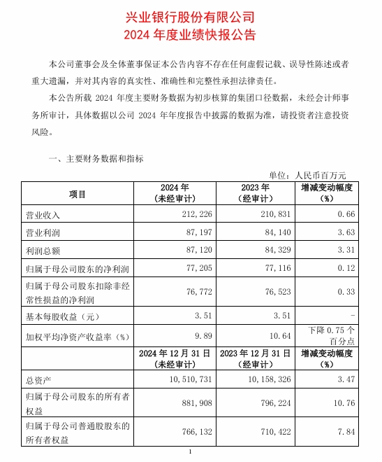 而前一日,即1月15日,興業銀行發佈2024 年度業績快報公告。根據公告,2024年,興業銀行實現營業收入2122.26億元,較上年同期增長0.66%;利潤總額871.2億元,同比增長3.31%;歸屬於母公司股東的淨利潤772.05億元,同比增長0.12%。