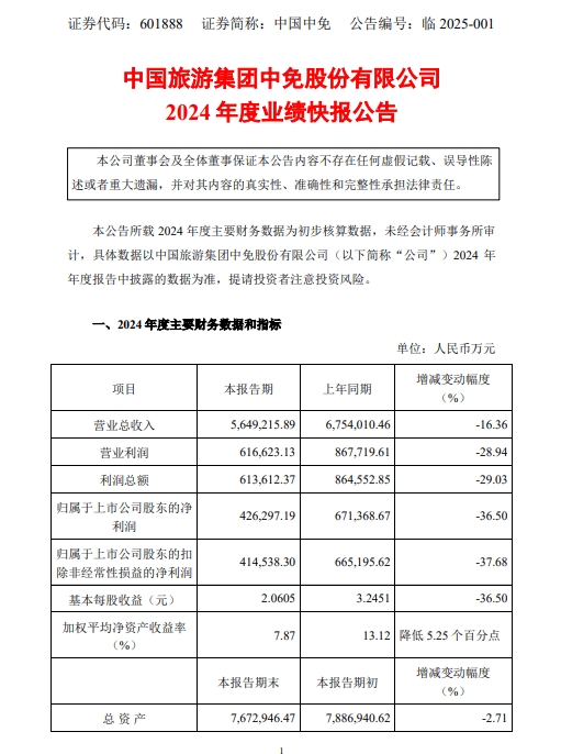 【環球網消費綜合報道】1月16日,中國中免發佈《2024年度業績快報公告》。根據《公告》,2024年,中國中免實現營業總收入564.92億元,較上年同期下降16.36%;歸屬於上市公司股東的淨利潤42.63億元,同比下降36.5%;基本每股收益2.0605元,上年同期為3.2451元。對於淨利潤及基本每股收益下滑,該公司表示,主要是受消費需 求放緩及行業週期影響,公司經營業績持續承壓。