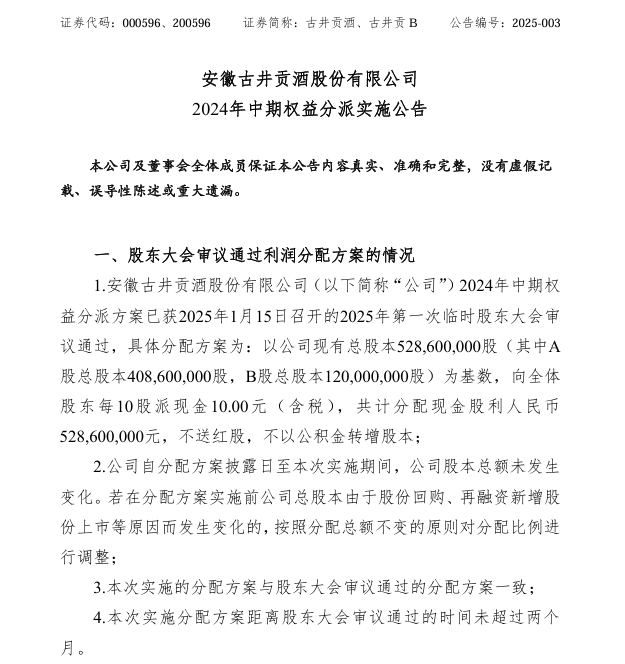 而具體分配方案:以古井貢酒現有總股本5.29億股為基數,向全體股東每10股派現金10元(含税),共計分配現金股利5.29億元,不送紅股,不以公積金轉增股本。且本次分紅派息A股權登記日為1月23日,除權除息日為1月24日。而B股最後交易日為1月23日,除權除息日為1月24日,股權登記日為2月5日。
