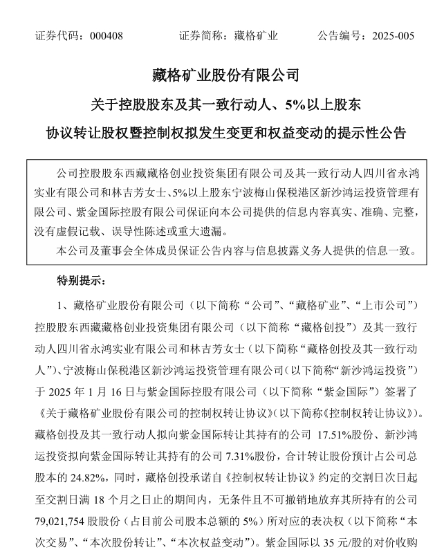進一步來講,藏格創投及其一致行動人擬向紫金國際轉讓其持有的公司 17.51%股份、新沙鴻 運投資擬向紫金國際轉讓其持有的公司7.31%股份,合計轉讓股份預計佔公司總股本的24.82%。同時,藏格創投承諾自《控制權轉讓協議》約定的交割日次日起 至交割日滿18個月之日止的期間內,無條件且不可撤銷地放棄其所持有的公司 79,021,754 股股份(佔目前公司股本總額的5%)所對應的表決權。
