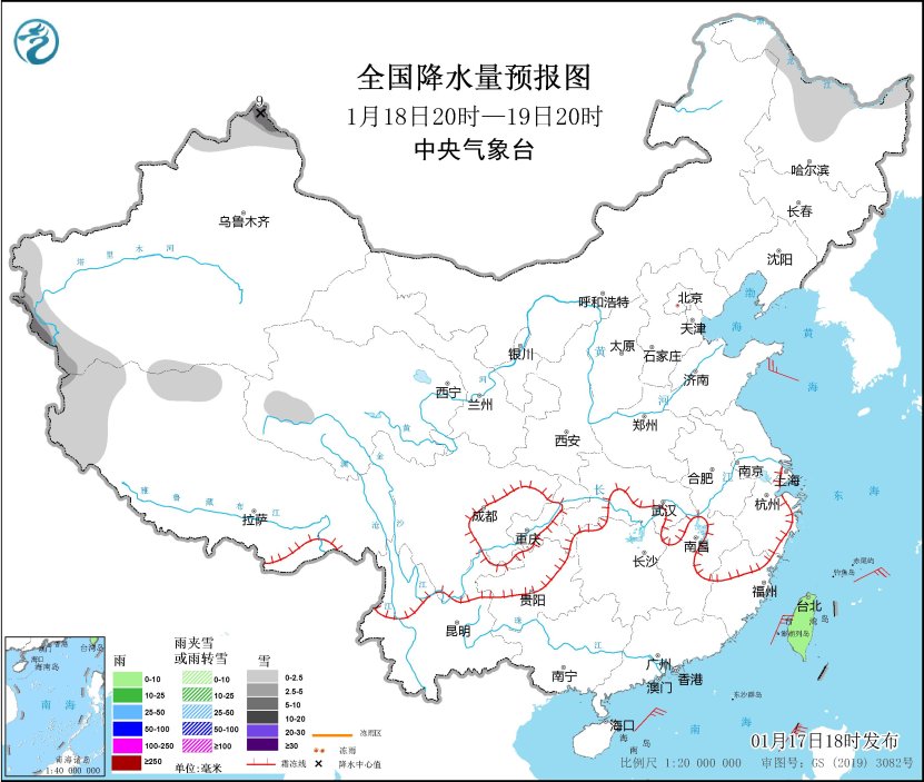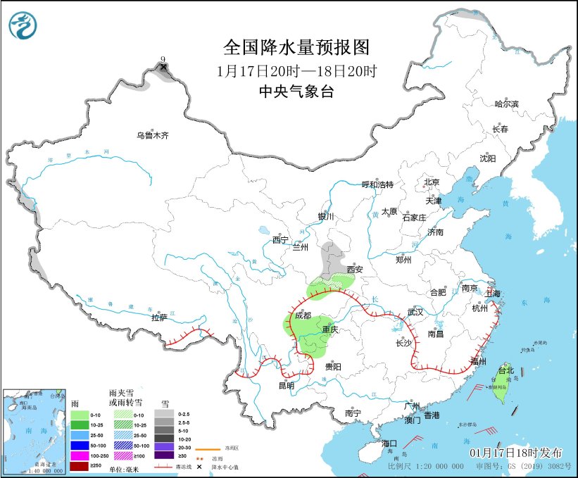 *1月17日20時至18日20時,*新疆北疆北部和南疆西部山區、西藏西部、甘肅東部和南部、寧夏南部、陝西中南部等地部分地區有小雪或雨夾雪,其中,新疆北疆北部等地部分地區有中到大雪(5~9毫米)。陝西南部、四川盆地中南部、重慶西部、貴州西北部、台灣島等地部分地區有小雨(見圖1)。