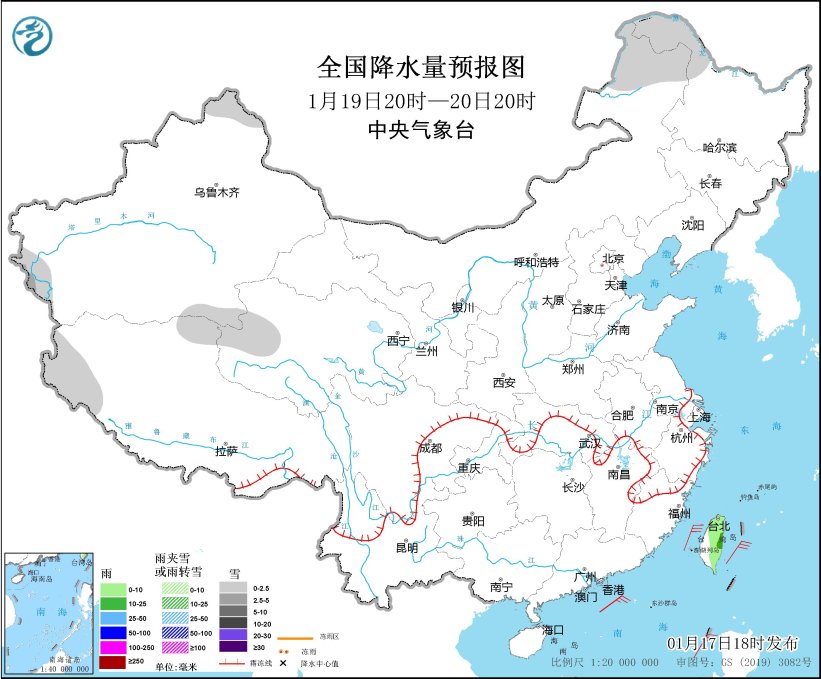 *1月19日20時至20日20時,*新疆北部和西南部、內蒙古東北部、黑龍江西北部等地部分地區有陣雪或小雪,局地中雪。台灣東部等地部分地區有小到中雨。內蒙古中東部、山東半島等地部分地區有4~5級風;台灣海峽、南海中南部海域將有6~7級風(見圖3)。