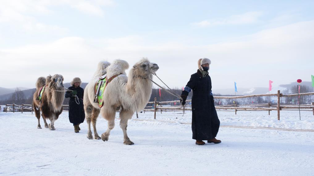 牧民牽着駱駝進入阿爾山市迎新年冰雪那達慕現場。新華社記者 恩浩 攝