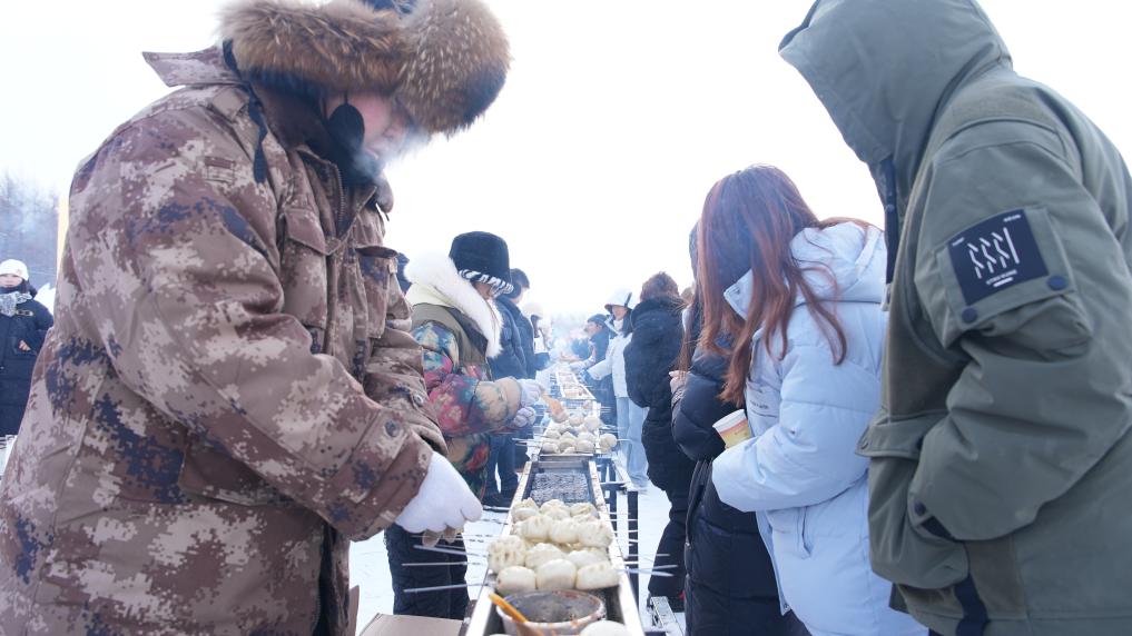 遊客在阿爾山市迎新年冰雪那達慕現場排隊品嚐美食。 新華社記者 恩浩 攝