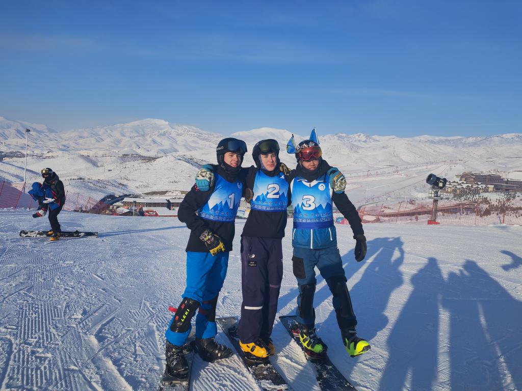 在單板滑雪比賽後,俄羅斯和哈薩克斯坦運動員合影留念。 新華社記者 孫哲 攝