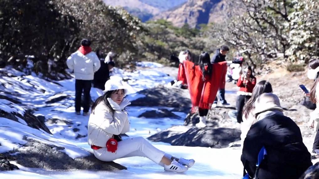 ■位於春城昆明北部的轎子雪山,是中國緯度最低的冬季積雪山峯之一。隆冬時節,這座雪山再度披上銀裝。鮮見雪景的東南亞遊客興奮地到此體驗高山冰雪遊,藍天、冰湖、冰瀑、霧凇成為他們鏡頭下的“寵兒”。