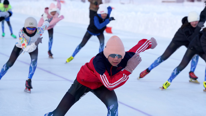 1月9日,在新疆阿勒泰市體育公園,阿勒泰市業餘體校的小隊員們正在練習滑行技巧。新華社記者 張嘯誠 攝