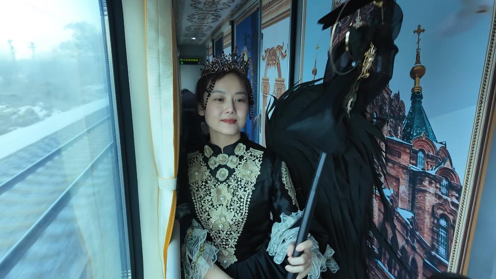 東北特色大花襖、魔法袍、公主風裙裝……更衣室內,各式服裝配飾一應俱全,車廂的壁紙還設計了哈爾濱街景、歐式風情、冰雪奇遇等主題場景,滿足旅客的不同需求。