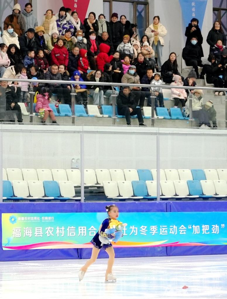 在花樣滑冰項目比賽現場,一名小選手在賽後收穫了觀眾贈送的玩偶。 新華社發(張福新 攝)