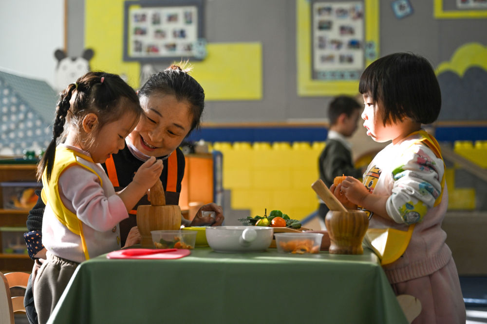 在青海省西寧市城中區一家托育中心,老師帶孩子們體驗勞動課程(2024年12月12日攝)。 新華社記者 張龍 攝