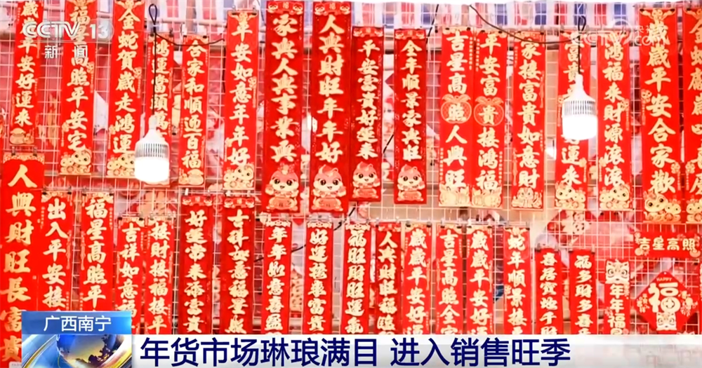 *央視網消息:*臨近春節,掛燈籠、貼春聯、買年貨是必不可少的環節,寄託着人們對新春的美好願望。在廣西南寧市上海路年貨交易市場里人頭攢動,各式各樣的春聯、糖果及裝飾掛件擺滿各個攤位,市場裏瀰漫着濃厚的年味。