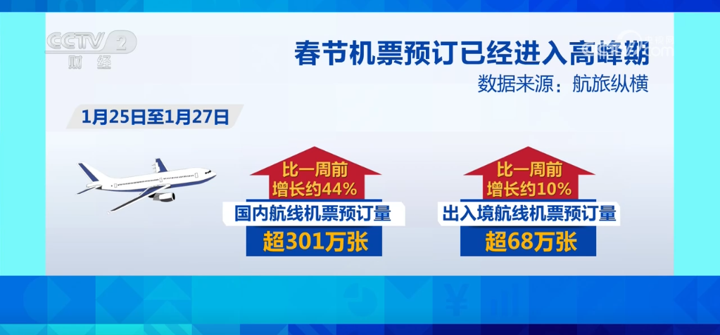 截至目前,1月25日至1月27日的國內航線機票預訂量超301萬張,比一週前增長約44%;出入境航線機票預訂量超68萬張,比一週前增長約10%。春節機票預訂已經進入高峯期,各大航司紛紛加大運力投入,保障旅客春運出行。