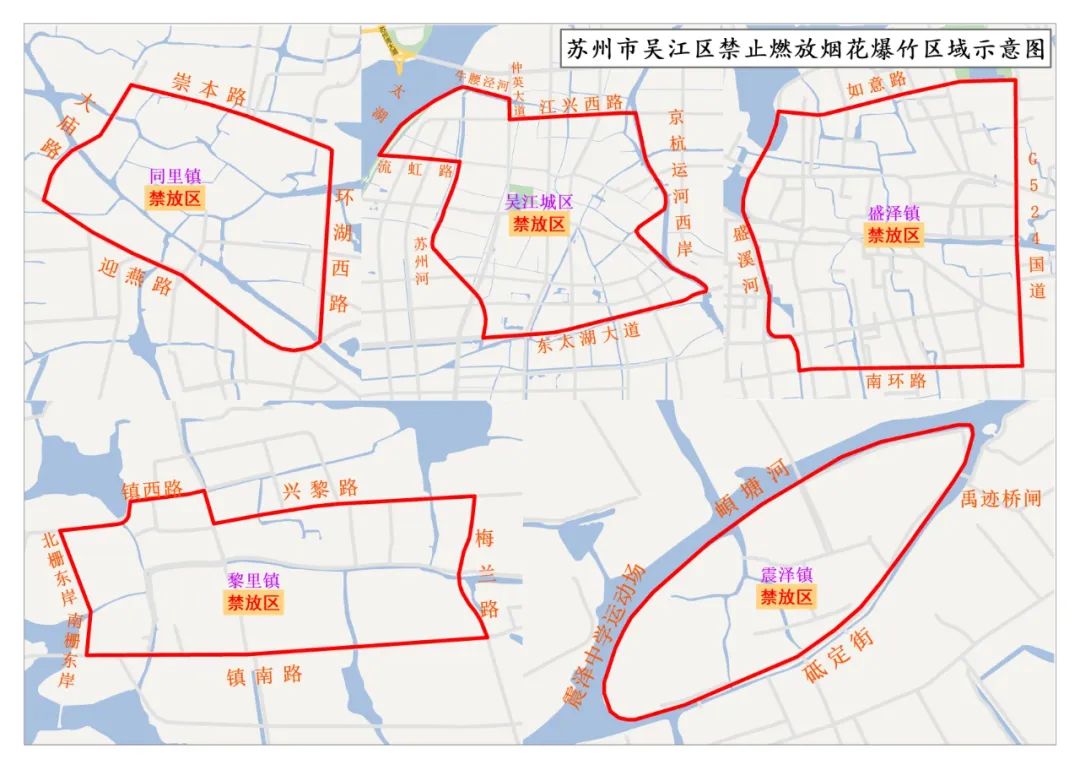 *(六)吳江區:*江陵街道東至仲英大道,南至江興西路,西至蘇州河,北至牛腰涇河;同裏鎮東至環湖西路,南至迎燕路,西至大廟路,北至崇本路;黎裏鎮東至梅蘭路,南至鎮南路,西至北柵東岸、南柵東岸,北至鎮西路、興黎路、人民東路;盛澤鎮東至G524國道,南至南環路,西至盛溪河,北至如意路;太湖新城東至運河,南至東太湖大道,西至太湖、流虹路、蘇州河,北至江興西路;震澤鎮東至禹跡橋閘,南至砥定街,西至震澤中學運動場,北至頔塘河,四面沿河。