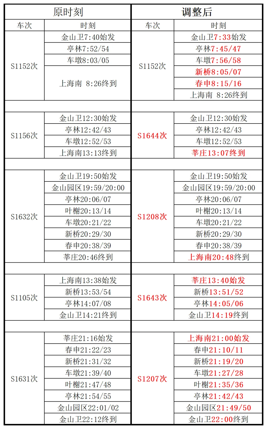 S1152次列車金山衞站始發時間為7:33(較目前提前7分鐘),增加新橋、春申兩個停站,進一步提高列車早通勤帶客能力。原S1631次列車車次改為S1207次,始發站由莘莊站改為上海南站,發車時間調整為21:00。