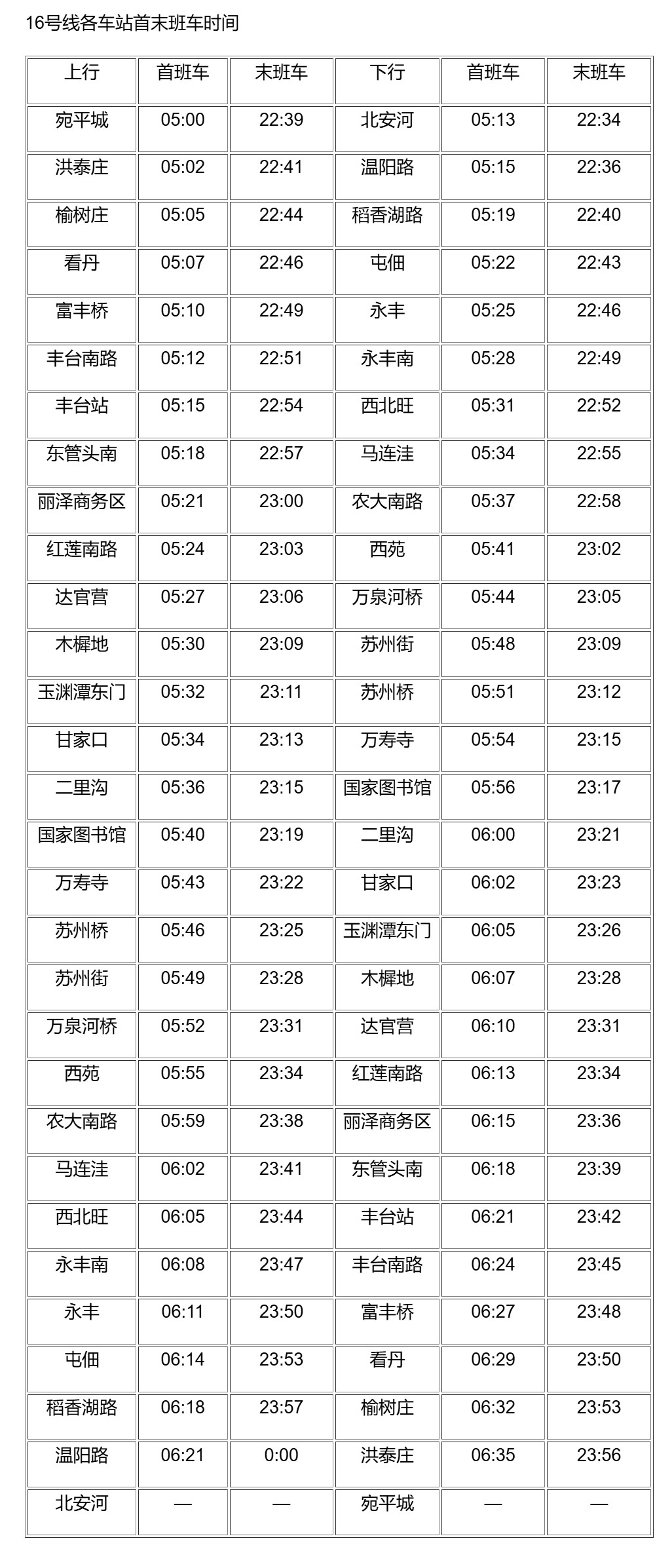 今晚,16號線麗澤商務區站首末班車時間公佈,上行(開往北安河站方向)首班車時間為05點21分,末班車時間為23點00分;下行(開往宛平城站方向)首班車時間為06點15分,末班車時間為23點36分。16號線其他各站首末班車時間不變。