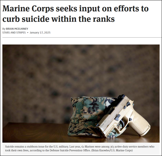 據美國國防部“預防自殺辦公室”發佈的年度報告,在過去一年裏,美軍共有363名現役軍人自殺,其中海軍陸戰隊有61人。按照各軍兵種人數及該部隊自殺人數綜合計算,海軍陸戰隊自殺率在各軍兵種中排名第一。