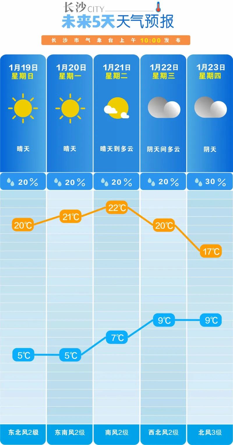 根據長沙市氣象台最新天氣預報,19日,長沙晴天,氣温5℃至20℃;一直到22日,雲系變化為主,長沙晴天或多雲,21日最高氣温升至22℃左右;23日到25日,高空波動配合地面冷空氣共同影響,長沙有一次降温降雨天氣過程,其中25日夜間高海拔山區或有雨雪相態轉化。