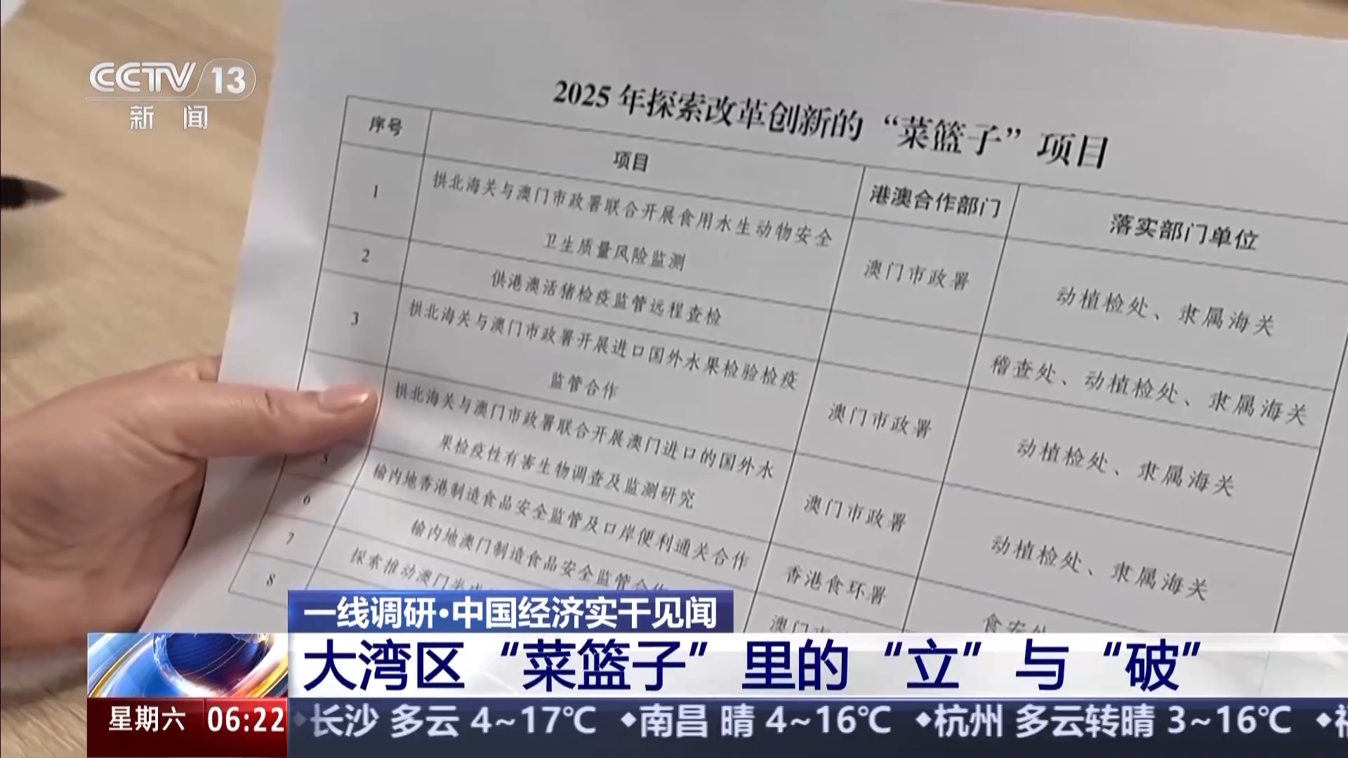 在拱北海關的會議室裏,一份2025年的改革清單剛剛出爐。記者看到,*多項改革舉措和“菜籃子”產品的通關便利化、監管合作直接相關,改革任務已經細化到內地和港澳的具體部門。*相互之間的市場聯通在加速。