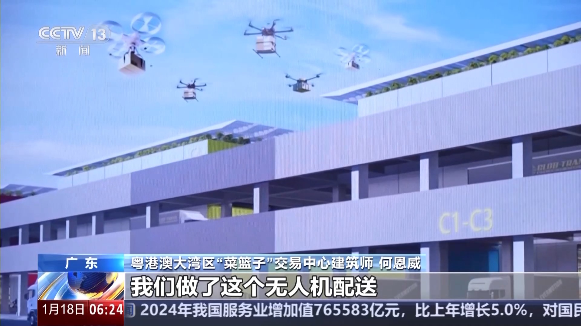 *粵港澳大灣區“菜籃子”交易中心項目建築師 何恩威:*傳統的市場是單層的,我們做了三層。首層我們設的是果蔬交易,二層是進口食品,三層我們是做了加工配送中心,而在頂上,為了低空經濟的發展,我們做了無人機配送。