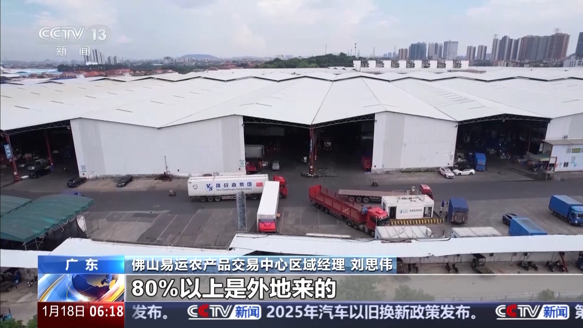 臨近春節,“菜籃子”採購迎來高峯。廣東佛山,這個果蔬批發市場的營業時間從每天14個小時拉長到16個小時,交易不斷,來自全國各地的冷櫃車、拖掛車來來往往。