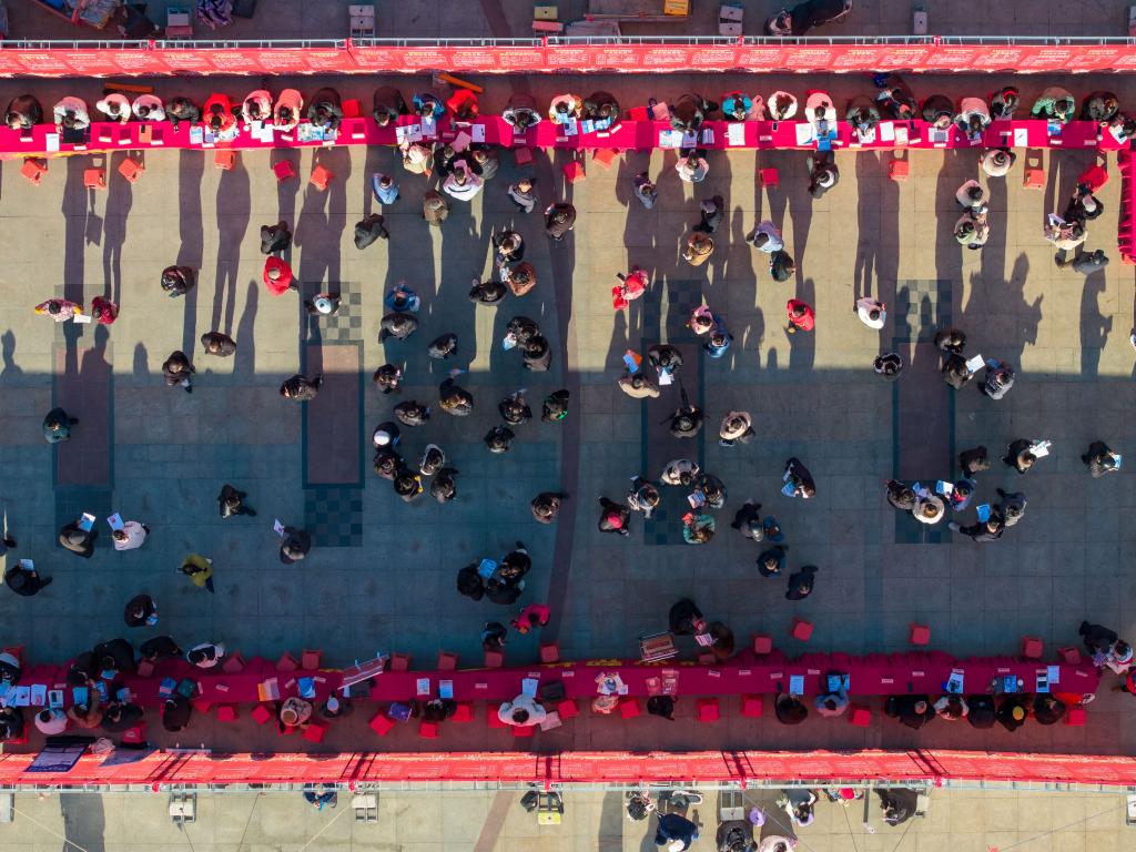 2025年1月15日,求職者在招聘會現場瞭解招聘信息(無人機照片)。新華社發(阮雪楓攝)