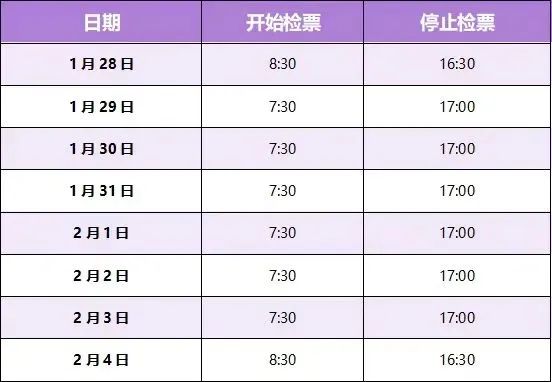 春節假期第一天(1月28日)和最後一天(2月4日),開放時間為8:30-18:30(16:30停止檢票),按照最大承載量65000人投放門票,即65000 張;