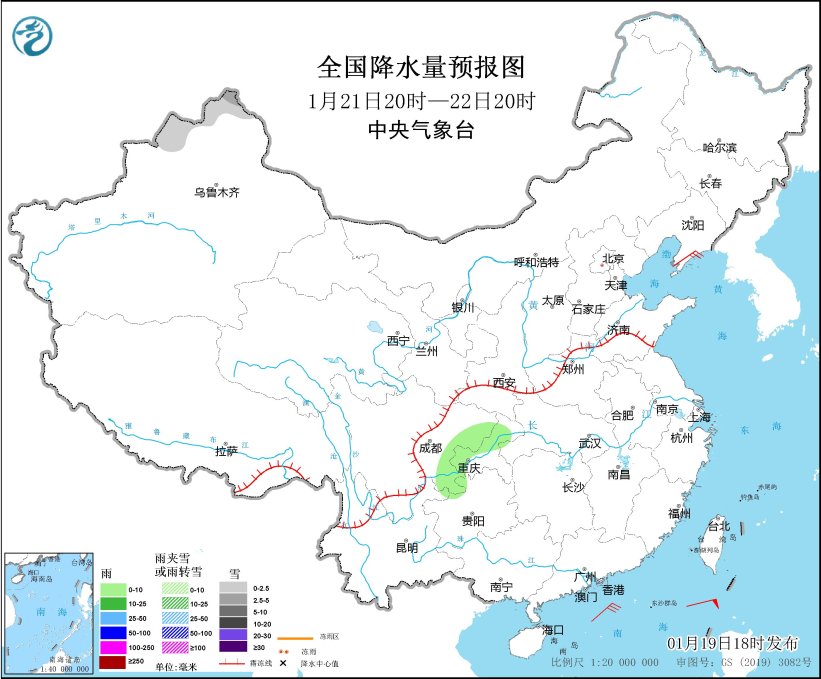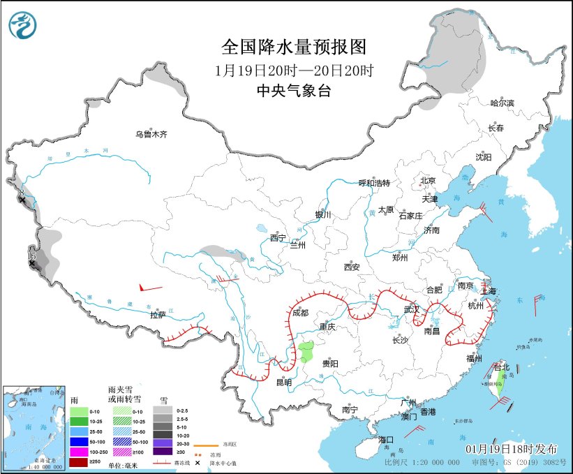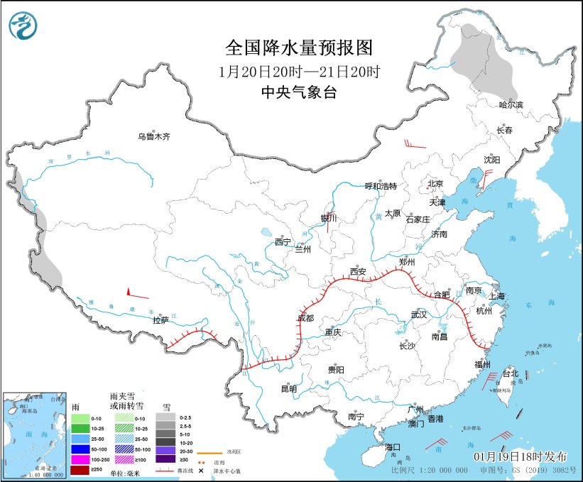 圖1 全國降水量預報圖(1月19日20時-20日20時)