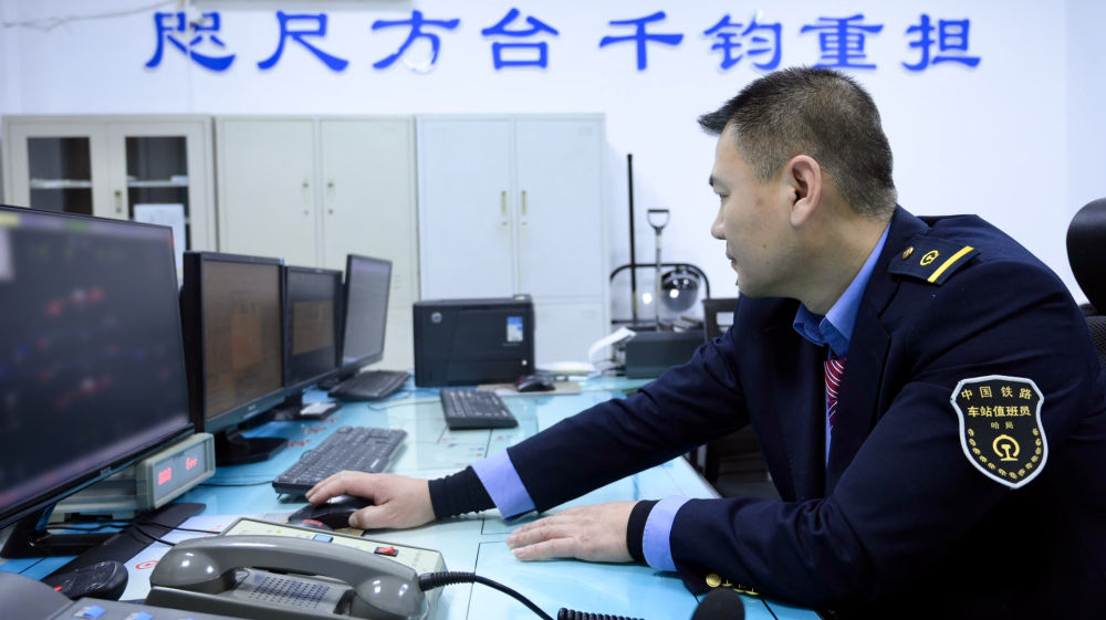 一間不大的值班室,除了牀就是操作枱,“咫尺方台 千鈞重擔”的條幅下,田春緊盯顯示屏。他負責運輸組織調度,是車站“最重要”的崗位。