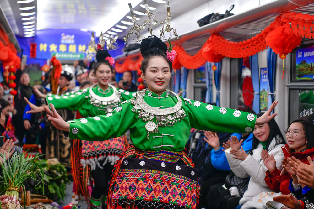 1月18日,少數民族演員在5640次列車上給乘客和村民跳苗族錦雞舞。新華社記者 楊文斌 攝