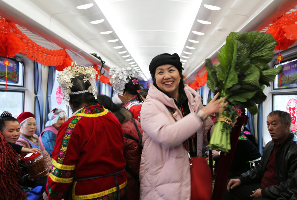 1月18日,在滬昆鐵路六個雞火車站,村民準備登上5640次列車售賣蔬菜和年貨。新華社記者 楊文斌 攝