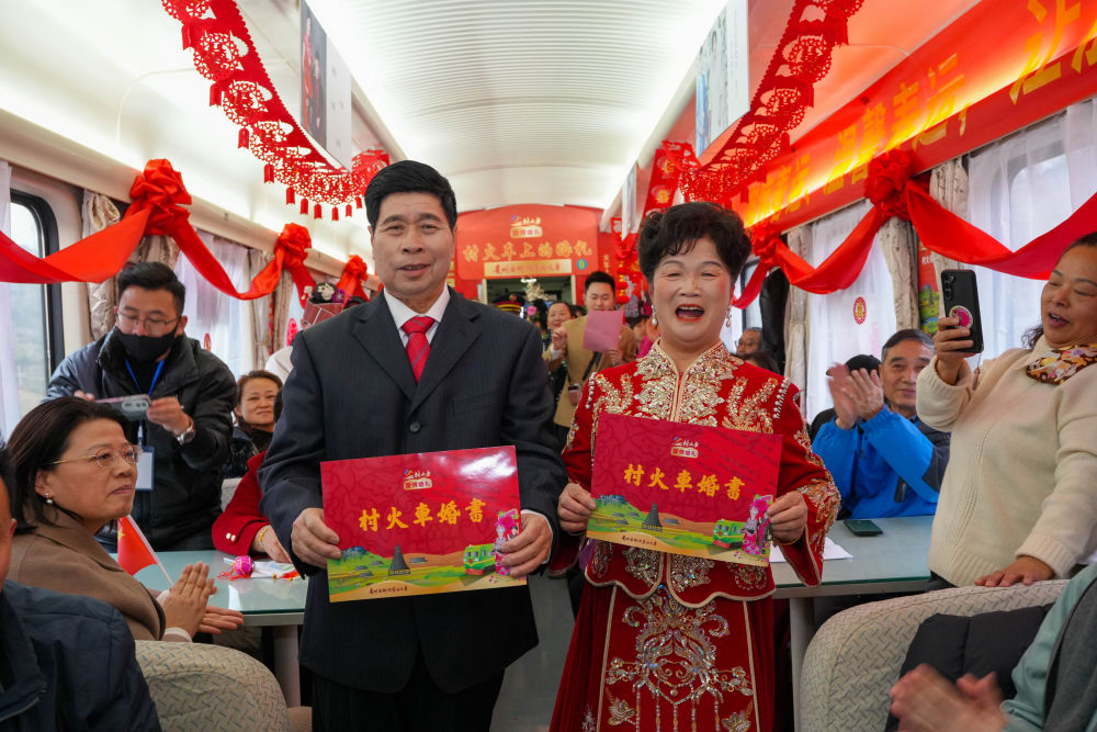 1月18日,一對金婚夫婦在5640次列車上舉行“村火車上的婚禮”。新華社發(龍建睿 攝)