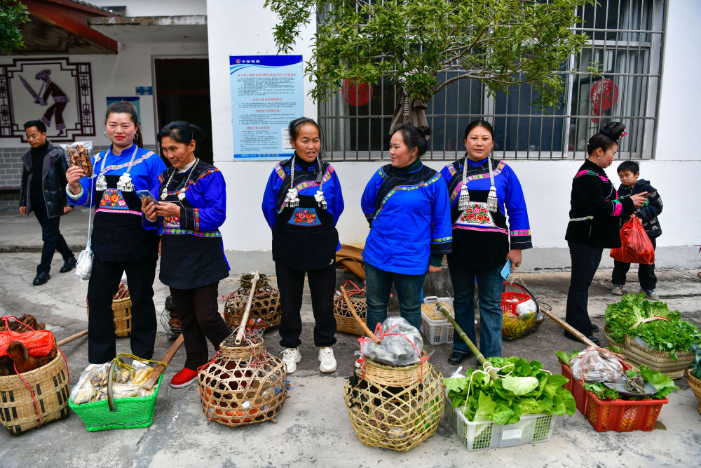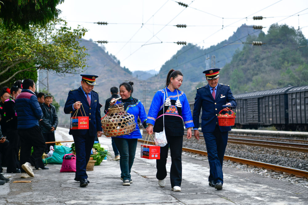 1月18日,在滬昆鐵路六個雞火車站,鐵路工作人員與村民交流當天售賣的農產品情況。新華社記者 楊文斌 攝