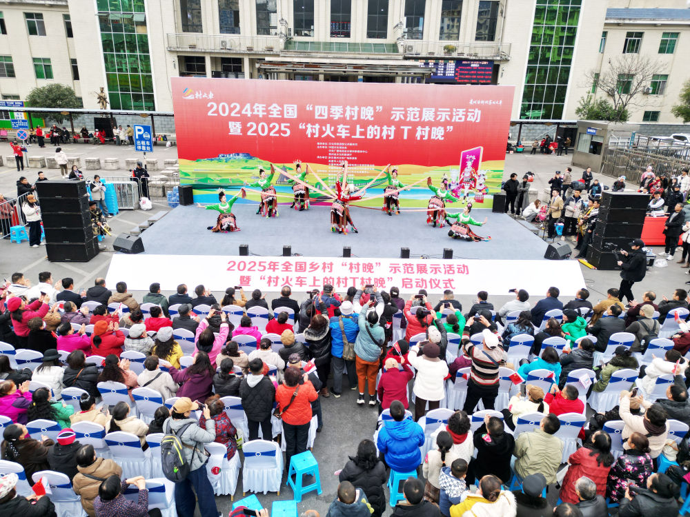 新鮮的農產品、喜慶的車廂、特色的民族歌舞、精美的非遺展示……1月18日,2025年全國鄉村“村晚”示範展示活動暨“村火車上的村T村晚”啓動儀式,在貴陽開往玉屏的5640次“慢火車”上舉行。
