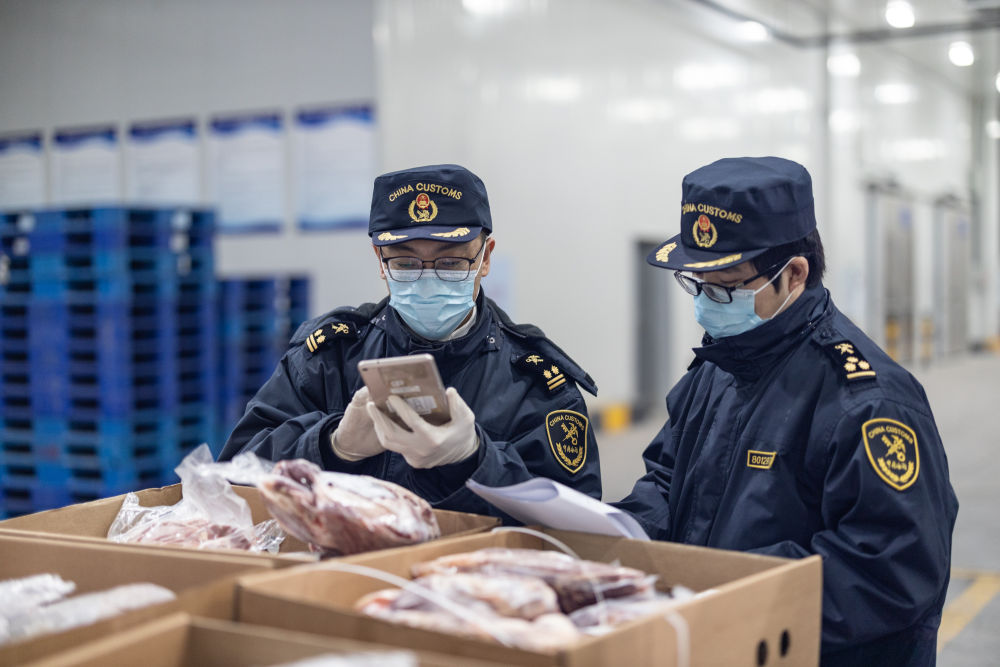 打開米白色的冷凍集裝箱,重慶海關所屬渝州海關監管科副科長劉議凡與同事正仔細查驗一批來自歐洲的肉類。不久後它們將被送至川渝地區各大商超、火鍋店。