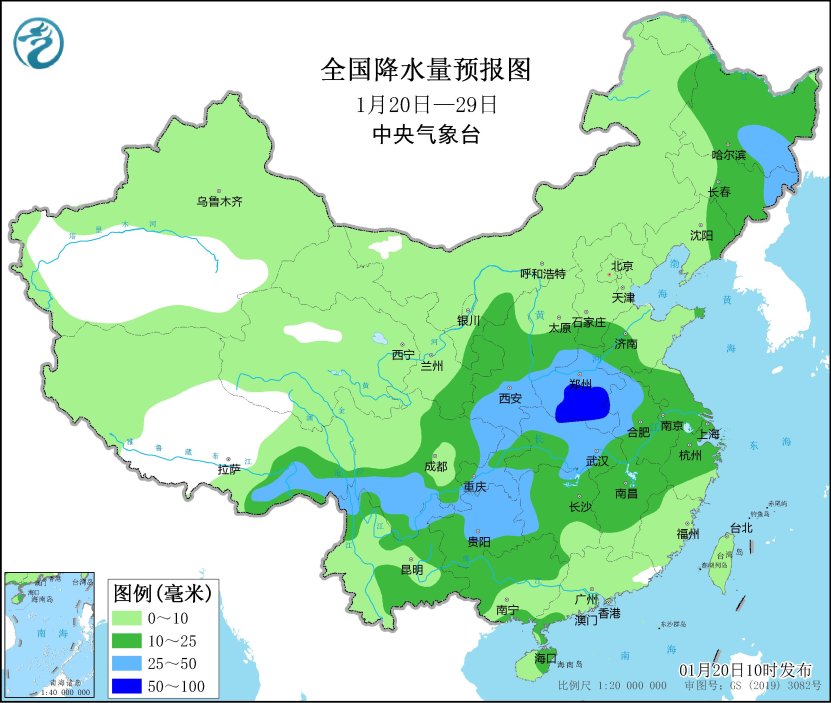 未來10天(1月20-29日),西南地區東部、西北地區東部、華北大部、東北地區東部、黃淮、江淮、江漢、江南等地累計降水量有5~15毫米,四川盆地東部、江漢、黃淮、江淮、江南北部及貴州等地的部分地區有20~40毫米;上述大部地區累計降水量較常年同期明顯偏多,主要出現在24-26日。