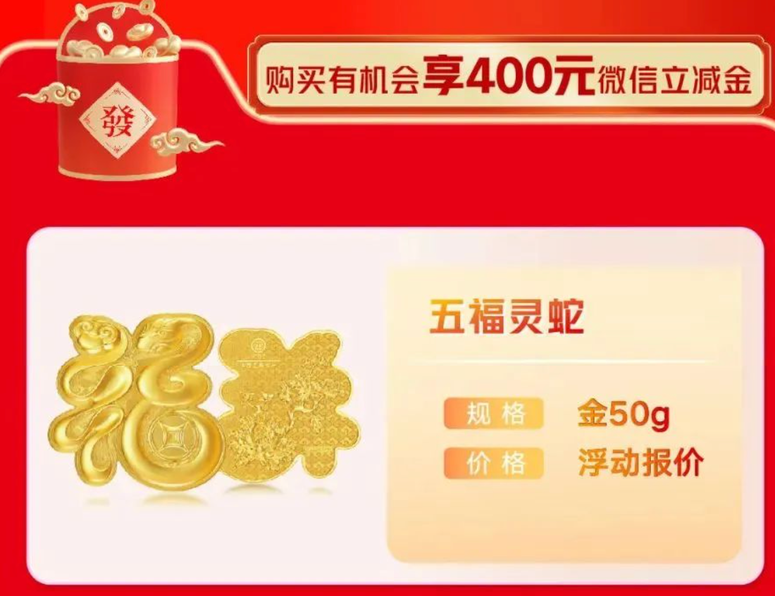 近日,建設銀行、工商銀行、中國銀行等多家國有大行推出“2025年蛇年生肖金條”“黃金壓歲錢”等特色產品,並推出了限時優惠活動。例如,建設銀行的蛇年壓歲金克重5克,原價5800元,在2024年12月10日至2025年2月14日期間提供了九折優惠,優惠價5220元。同時,該行還推出蛇年壓歲金標準版(0.6克),蛇年壓歲金小禮包(2.4克),並附贈央視春晚限定徽章全套。