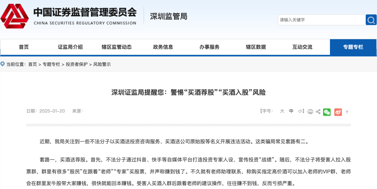 深圳證監局提示:警惕“買酒薦股”“買酒入股”風險