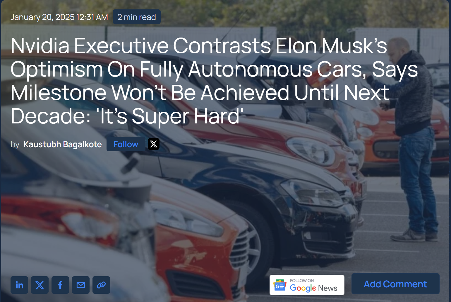 【環球網智駕綜合報道】1月20日消息,英偉達汽車業務副總裁阿里·卡尼(Ali Kani)近日在接受媒體採訪時表示,完全自動駕駛汽車在2030年前不太可能在公共道路上全面投入使用。儘管目前部分汽車已經在特定受控環境下實現了有限的自動駕駛功能,但要實現真正的自動駕駛,仍需在計算能力和技術上取得進一步突破。